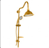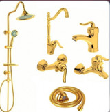 ست شش تکه شیرآلات طلایی قاجاری بامبو با علم دوش دوکاره شیپوری و شلنگ توالت ریزبافت (مجموعه ۶ عددی)