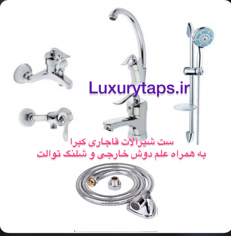 ست شش تکه شیرآلات قاجاری کبرا به همراه علم دوش خارجی و شلنگ توالت